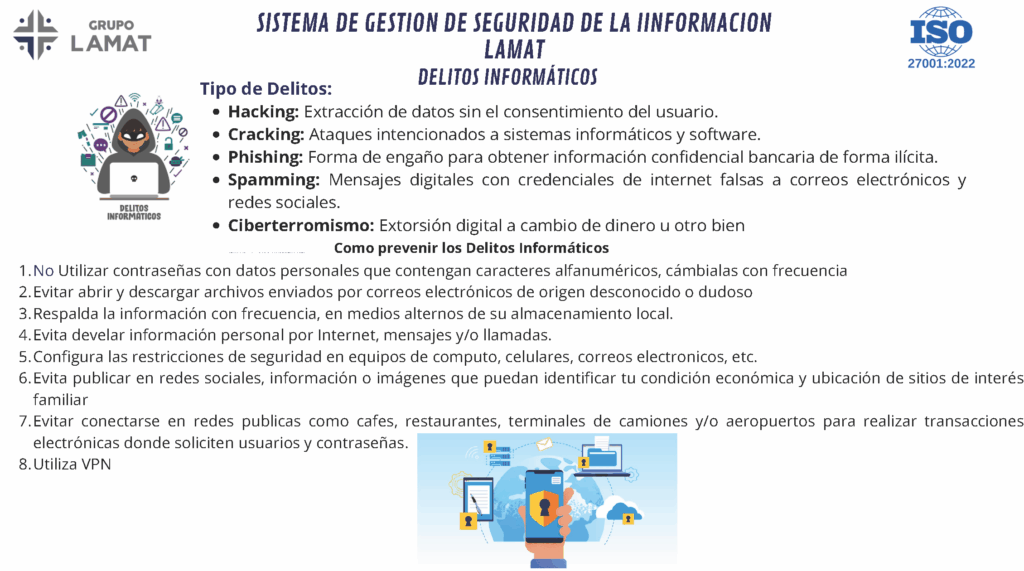 1. Se nos ha reiterado hacer uso correcto de nuestras laps, contraseñas e información que resguardamos. Por lo qué es responsabilidad de cada uno cuidar la información de la empresa, asi como nuestros datos personales. En la actualidad hay un sinfin de formas de extorcionar, entre ellas con el robo de información hacking, plishing y spamming. Es a los que estamos más expuestos por ser los más comunes. Entre las acciones que realizo es usar contraseñas distintas, utilizar más de 12 caracteres entre letras y numeros. Evitar abrir links y correos desconocidos o de dudosa procedencia, reportarlos inmediatamente al área de TI. De forma prsonal, evito publicar mi ubicación en tiempo real en las diversas redes, me conecto mayormente en redes de confianza y cambia la contraseña de mis app bancarias de forma frecuente.